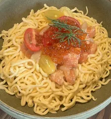 海鮮パスタのディル添え いくら、サーモンと海鮮をたっぷり絡ませたパスタです。さっぱりするためにトマトをプラス。 パスタ自体に味付けはしておらず、海鮮の味を楽しめました。 仕上げにディルをのせて完成です。