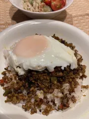 ♯2026カレーの日 キーマカレーに卵を載せてお代わり~家族皆でお代わりでカレー不足でした卵半熟希望が残念ながら目玉焼き状態 (*_*)