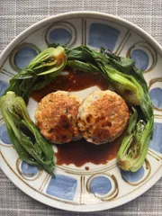 おからと鱈のヘルシーハンバーグ おから80g、鱈すり身60g、塩、醤油、オイスターソース適量、胡麻油適量、片栗粉適量、青梗菜適量鱈をすり鉢で細かくしておからを加えてさらにすり鉢で混ぜ合わせながら塩、醤油で味を整えながら繋ぎに片栗粉。平たく形成してフライパンに胡麻油を入れ全体を焼く。焼き上がったらフライパンから取り出して火を止めてフ