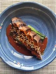 鰹のタタキ5切れ、コチジャン大さじ1、サムジャン小さじ1、醤油適量、ラー油適量、胡麻油適量、塌菜適量、白胡麻適量、水小さじ1〜2、一味適量塌菜を下茹でして水気を切り、器に盛り付ける。コチジャン、サムジャンを水で溶いて、胡麻油、醤油、ラー油、一味を加えながら味を整える。塌菜の上に鰹のタタキを乗せてタレ
