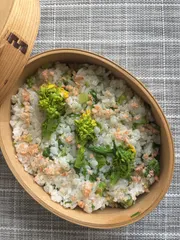 干し海老を30分水に付けて柔らかくなったらみじん切りにしておく。ご飯に米酢と塩糀パウダーを混ぜて酢飯にしたら細かく切った菜の花と白胡麻を混ぜ合わせる。器に盛り付けたら干し海老を振りかけて完成。酢飯に塩糀パウダーの柔らかい塩味と旬の菜の花、桜色の干し海老で春のお弁当。
