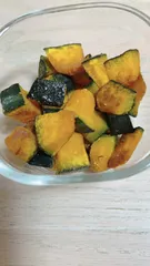 今週の作りおき かぼちゃの煮物を作っている時に、形の悪い部分を細かく切って、オリーブオイルで炒めて、塩、クミン、ホワイトペッパーで味付けました。お弁当の一品です。
