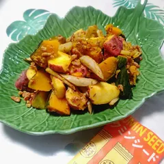 かぼちゃ、さつまいも、ごぼうと挽き肉にテンパリングしたクミンと塩がとっても美味しそう✨️ 野菜の甘みとクミン、塩が合うんですね😀