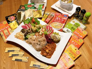 【材料】 (果)いちご (果)キウイ(ルビーレッドor紅妃) (野)キャベツ&人参ミックス (野)きゅうり (乳)クリームチーズ (穀)ごはん(おこわor炒飯) (野)サラダ菜 (野)セロリ (鶏卵)たまご(焼)(具材不明) (野)玉ねぎ (野)トマト (肉)鶏肉(ささみ) (野)パセリ (菌)ぶな