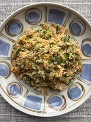 小松菜たっぷりチャーハン 小松菜2束、ネギ適量、醤油適量、塩胡椒、生塩糀小さじ2、ガーリックパウダー適量、卵1個小松菜を細かく切る。鍋に油卵を入れ、ご飯、塩胡椒して炒める。小松菜を加えたらガーリックパウダー、生塩糀を加えて仕上げにネギと醤油で完成。小松菜たっぷりで、塩糀とガーリックパウダーで風味の良い小松菜のチャーハン!