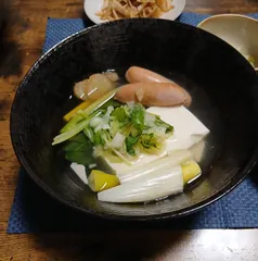 粗挽きソーセージベーコン 小松菜の 生姜湯豆腐 玉葱三葉添え