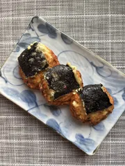 イカ団子の磯辺揚げ イカ適量、木綿豆腐半分、海苔1枚、塩適量、片栗粉適量、生姜小さじ1、醤油適量、胡麻油適量木綿豆腐を絞って水分をよく取る。イカをすり鉢で擦った物と細かく切った物に木綿豆腐を加えて良く混ぜ合わせながら塩、醤油、生姜、胡麻油。片栗粉を足しながら形成して海苔を付けて揚げる。お好みの漬けダレで食べれるイカ団子