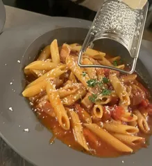 アラビアータ ホールトマト缶を使ってアラビアータ♪肉を炒めてトマト缶、水を入れて煮込みます。そこにマジョラム、バジルを入れます。 パセリはのせました♪仕上げのチーズはチーズおろしを使ってたっぷりと。