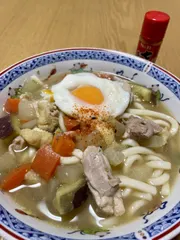 ほうとう風うどんの朝ごはん インスタで見かけて美味しそうだったので、今朝はほうとう風のうどん。保育園の人気メニューだとか。味噌仕立てのうどんです。本当はかぼちゃだそうですが、なかったのでさつまいもで代用しました。美味しかったです😊