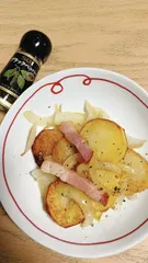 薄く切ったじゃがいもに火を通し、玉ねぎとベーコンとほんの少しの塩を加え、お皿に盛った後、ブラックペッパーをふりかけました。ピリリとブラックペッパーが感じる一品になりました。