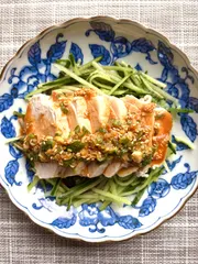 にんにく味噌ベースのよだれ鶏 鶏がらスープ80ミリ、米酢80ミリ、にんにく味噌適量、一味適量、ラー油適量、醤油適量、ネギ適量、胡麻適量、鶏胸肉250g、キュウリ1本沸騰させたお湯に、生姜、塩を加えたら火を止め鶏胸肉をを入れ40分おき、40分経ったら取り出して沸騰させ火を止め鶏胸肉を入れる。火が通るまで2、3回繰り返す。粗熱を取り