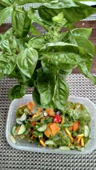 家庭菜園で採れた各種の野菜でサラダを作りました。バジルも入れてあります。バジルの香りが漂います。