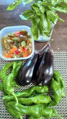 家庭菜園で採れたものです。なす、甘しし唐、バジル、人参などでピクルスを作りました。酸っぱさがたまりません。美味しい。