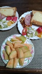 家庭菜園で採れたメロンです。サラダの野菜も家庭菜園ですよ。