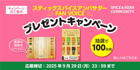 【スティックスパイス FAN VOICEをお持ちの方へ】プレゼントキャンペーンのご案内 スティックスパイス FAN VOICEをお持ちの方へこんにちは!SPICE&HERB COMMUNITY事務局です。「スティックスパイス FAN VOICE」をお持ちの方がご参加いただけるプレゼントキャンペーンについて、「FAN VOICE」冊子内でもご案内しておりますが、本記事では更に詳し