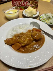 カレーの夕ご飯 帰宅して夕方に20分くらい意識を失ってました(つまり寝てた😛)テレビ見て待っててくれた子供達ありがとう😭朝作っておいたカレーに助けられました。カレーとサラダとフルーツとヨーグルトだけでしたが、カレーは完全食だし良いですよね😁とけこむカレー美味しかったです