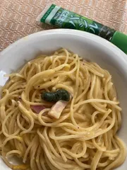きざみバジル&カルボナーラ SBきざみバジルをカルボナーラに入れました。バジルの中にチーズパウダーが入っているためカルボナーラのチーズにさらに追い打ちをかける様なチーズのコクがマシマシでバジルの香りと共に美味しいです。 今更ですがチューブの「すぐ開きキャップ」使いやすいですね。キャップを捻る角度が狭くて済むので開け閉