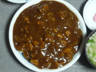 大盛りのチキンカレー 体重を気にして食べる量を減らしています。でも、カレーライスの時は例外です。大盛りにして食べてしまいます。美味しいですからね。数時間後、体重計に乗って後悔しますが、一瞬のことで、『しょうがいないよね、美味しかったから』で済ませてしまうのはいつものことです。