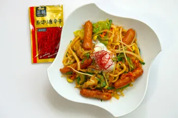 糸切り唐辛子でお洒落して キムチ入り焼きうどんを作りました。チーズ入り粗挽きウインナーでボリュームもアップし、温泉卵を乗せてとろーり美味しくいただけました。