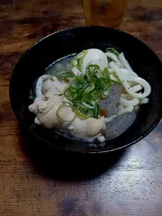 鶏だし手羽元茹で卵蒟蒻粗挽きブラックペッパーたっぷり葱のせうどん