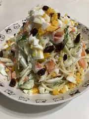 最後にレーズン、ゆで卵をちらして完成テーブルコショーを使いました🥰