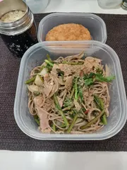 今日のお弁当🍱 春菊三つ葉ベーコン玉葱 ブラックペッパー煮干し粉 炒め蕎麦