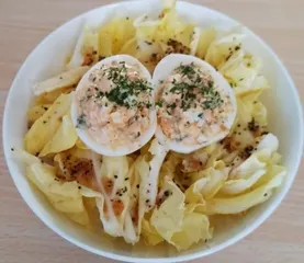 ゆで卵をつぶしてマヨ+あらびきブラックペッパー+四川風辣油+パセリを入れ混ぜ黄身を抜いた白身🥚に入れる春キャベツは手でちぎってめんつゆ+かんたん酢+オリーブオイル+あらびきブラックペッパーを混ぜたドレッシングで和えるだけです😊