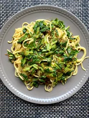 ほうれん草と搾菜の上海焼きそば 細かく切ったほうれん草と搾菜を塩胡椒、醤油、胡麻油、オイスターソースで味付けし炒める。茹でた中華麺と具材を混ぜ合わせながら炒めて完成。