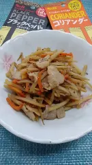 エスビー公式レシピ『減塩効果版きんぴらごぼう』を参考に豚肉入りで作りました。 コリアンダーとあらびきブラックペッパーのスパイスがアクセントになりとても美味しいきんぴらごぼうになりました✨スパイスで減塩効果になるのは嬉しいですね😊