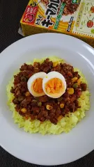 エスビードライキーマカレーパウダールウを使ってひき肉、玉葱、カットトマト缶、ベジタブルミックスで手軽にキーマカレーを作りました。ご飯はターメリックパウダー、バターでターメリックライスを作り、キーマカレーをのせて頂きました✨