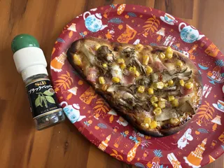 余ったナンで♪ まいたけピザを作りました。マヨネーズに少しだけめんつゆを入れて混ぜてソースを作り、ナンに塗り、ベーコン、コーン、まいたけをトッピング!オーブントースターで焼いて、仕上げにブラックペッパーをかけたらできあがりです。少し焦がしました…ブラックペッパーがいい感じにまとめてくださって、美味しかったです(๑´