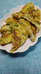 カレー味オムレツ オムレツを作りました。卵に玉葱、ピーマン、じゃがいもに、塩コショウ、カレー粉で味つけ焼きました。カレー味オムレツ美味しいですね😊