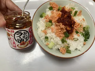 おかずラー油 温かいご飯の上に鮭フレーク、おかずラー油、小ねぎをのせるというシンプルなメニューですが美味しかったです♪