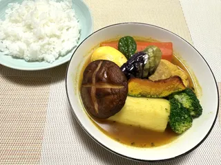気になっていたエスビー食品さんの商品ついに入手ー(((o(*゚▽゚*)o)))鶏肉、にんじん、長いもを入れて煮込んで作りました。かぼちゃ、しいたけ、ブロッコリー、なす、ピーマン、ゆで卵を乗せて完成!良い香りの美味しいスープカレーが出来上がりました。簡単ですし、とても美味しい!大満足です ♪今までどこ