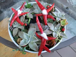 サンタクロース モニターで頂いた「たくさん採れる鷹の爪」でサンタクロースを作りました。この鷹の爪は沢山採れるだけでなく、大きくて立派です。サンタクロースも大きいのが作れました。動きがかわいいでしょう?多肉植物のリースに飾りました。さすがに12月になったのでそろそろ収穫はおしまいとは思いますが・・・沢山利用させてもら