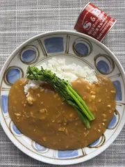 水を温めながら顆粒味噌を入れ、溶いてカレー粉とガラムマサラを加える。温まってきたらインスタントの納豆とホワイトペッパーを加える。カレー粉で味を整えて片栗粉でとろみ。ご飯と盛り付けたら下茹でした菜の花を添える。インスタントの納豆味噌汁を使って味噌+スパイスの納豆カレー。