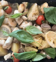 ガーリックシュリンプ🦐🧄🌿 仕上げにスイートバジルをたっぷりのせて、美味しく出来上がりです♪😋