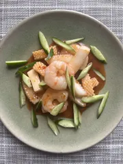 イカと海老のスイートチリソース炒め 紋甲イカを一口サイズに切って海老と一緒に塩胡椒で炒める。火が通ったらスイートチリソースとガーリックパウダーを加えて混ぜ合わせる。盛り付けたら種を取り除いたキュウリを切って振りかける。ガーリックパウダーとスイートチリソースの相性が良く、ビールに合う簡単おつまみ。