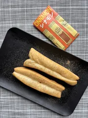 強力粉100g、薄力粉100g、ドライイースト小さじ1/3位、塩ひとつまみ、水適量100〜120ミリ、シナモン適量、グラニュー糖適量ボールに強力粉、薄力粉、ドライイースト、塩を入れ、水を加えながら練って丸く形成したらラップをして室温で膨らむまで2時間位置く。細長く伸ばして170度位の油で揚げる。盛り