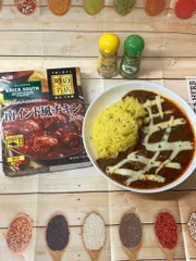 南インド風チキンカレーに溶けるチーズをのせて 美味しそうな(レトルト)カレー<中辛>が福袋に入っていました。スパイスがよく効いて辛そうだったので、熱いカレーを盛り付けてから溶けるチーズをのせてレンジで少し加熱しました。鶏肉・トマト・様々なスパイス、、、がよく煮込まれていて、旨みと辛さでとても美味しいランチになりました。