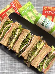 ケチャップにパプリカ、オレガノ、チリパウダー、ブラックペッパーを混ぜ合わせて4枚に塗る。バターを2枚に塗ってマジックソルトを振りかける。4枚の方にロースハム、サニーレタス、ロースハム、ニンジン、サニーレタスを乗せて挟んで縦に切る。バターを塗った2枚を使ってロースハム、サニーレタス、薄焼き卵、サニーレ