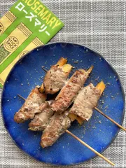 NEW 秋の味覚の串焼き ローズマリー風味 柿1/4、豚こま適量、ローズマリー適量、塩適量柿を棒状に切って豚こま肉に巻いて串に刺す。塩を振って炭火焼きにして盛り付けてローズマリーを振る。甘い柿と豚肉と以外な組み合わせもローズマリーの風味で美味しい秋の味覚に!