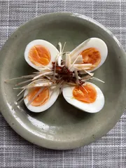油葱櫻花蝦醬で茹で卵前菜 油葱櫻花蝦醬小さじ1、ネギ適量、茹で卵2個卵を12分茹でて半熟にする。ネギを細切りにして油葱櫻花蝦醬と混ぜ合わせる。茹で卵を半分に切って盛り付けたらネギを乗せる。桜エビの香りたっぷりの醬とネギで中華前菜に!