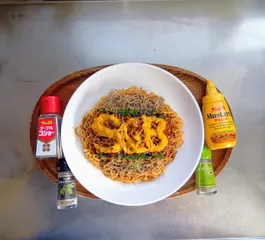コメント頂きまして ありがとう御座います。 具のない焼きそばを 少しだけ デコってみました。😀