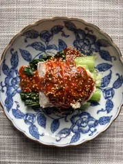 韓国風よだれ鶏 鶏胸肉200g、鶏がらスープ400ミリ、鷹の爪1本、ネギ青い部分、なつめ1個、生姜1片、塩適量、コチジャン適量、サムジャン適量、ラー油適量、胡麻油適量、醤油適量ネギ適量、白胡麻適量鍋に鶏がらスープを入れて、ネギ、なつめ、生姜、鷹の爪を加えて沸騰させて、火を止めて鶏胸肉を入れて40分置く。鶏胸肉を取り