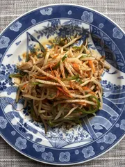 一味唐辛子たっぷりもやし炒め 一味唐辛子適量、もやし1袋、ピーマン半分、ニンジン適量、塩適量、甘口醤油適量ピーマンとニンジンを細切りにしてもやしと炒める。塩と一味をたっぷり加えて炒めたら仕上げに甘口醤油で味を整える。一味をたっぷり入れた爽やかな辛さのもやし炒め。甘口醤油で後味のバランス良く食べれます!
