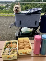お弁当作ってピクニック🧺 昭和の日の祝日に、お弁当を作って愛犬ラッキーとピクニックへ🐶🐾お弁当は、おにぎり🍙・ジャーマンポテト🥔・玉子焼き🥚・小松菜と人参の肉巻き🥬🥕・お好み焼き👩🍳ジャーマンポテトにはスティックスパイスのブラックペッパーをたっぷり振りかけました🥔