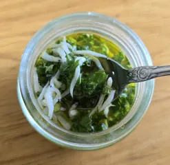 パセリの消費にも!万能パセリしらすオイル オリーブオイル パセリを丸ごとみじん切りしたものしらす きざみにんにく(お好みで)塩 ひとつまみ 清潔な瓶に入れるだけ🤭翌日から使えます。 パスタソースにしたり焼いたバゲットにただののせただけでも美味しいです😋🍴💕 簡単で美味しいのでぜひ👍✨