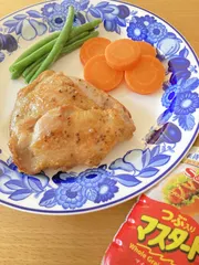 鶏ハム レシピを参考にして作りました。元々鶏むね肉があまり好きではないのですが、鶏ハムに挑戦しました。これは中に大葉やパセリ、玉ねぎ、にんにく、カマンベールチーズを挟み巻いています。何も無いより、間に挟んだほうが味に変化が合って美味しいです。ソースにエスビーさんのつぶ入りマスタードを使っています。(一緒の写