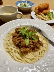 ミートソースの夕ご飯 ミートソースの夕ご飯。まだ庭で生きてくれているトッピングバジルを乗せました🌿バジル、ちょっと元気がなくなってきて、、冬は苦手かな?